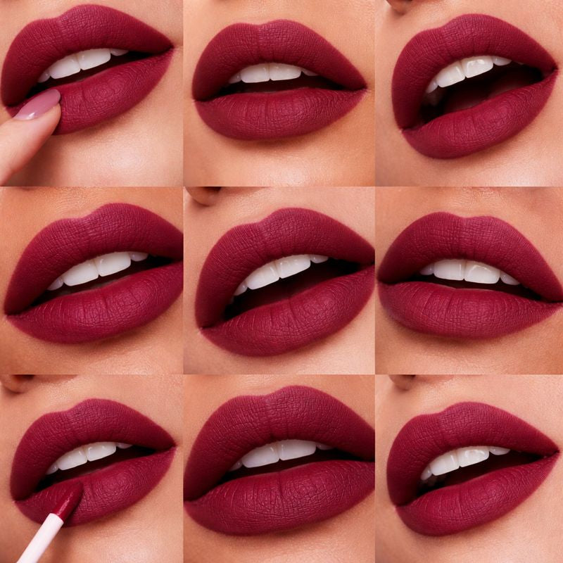 - Velvety wine-matte lipstick that glides on smooth and stays loud all day.